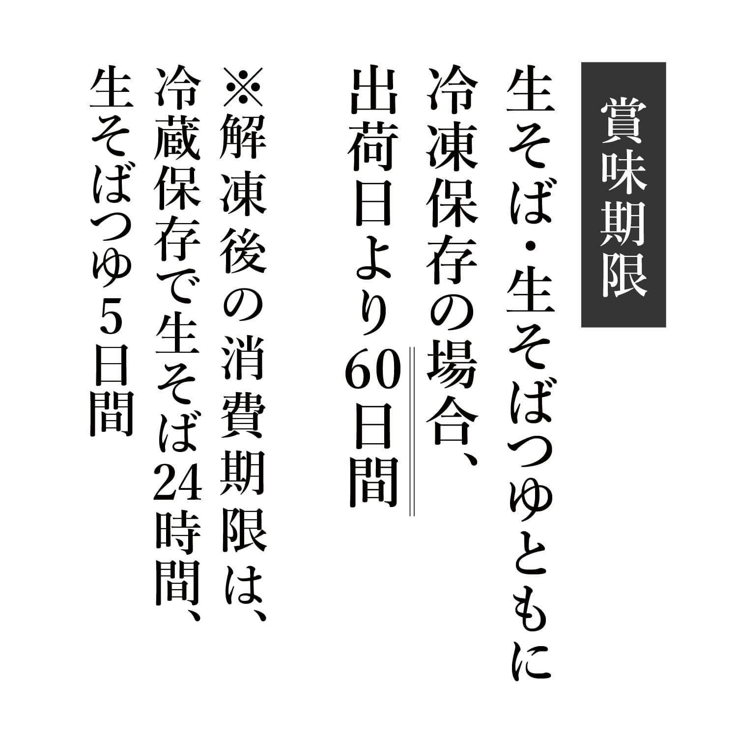 | 賞味期限 | 生そば・鴨汁:冷凍保存の場合出荷日より60日間 ※解凍後の消費期限は、冷蔵保存で24時間。 |