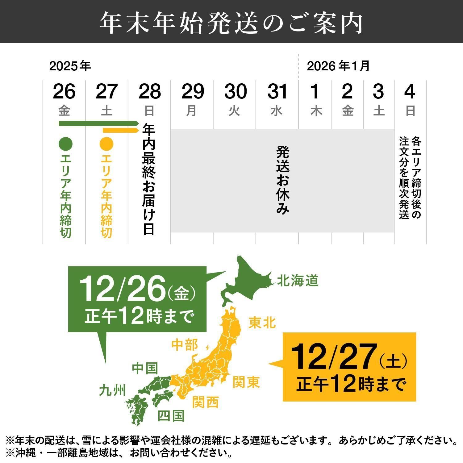 年末にお届けをご希望の場合、12月21日(日)〜12月28日(日)間は発送数の上限がございます。